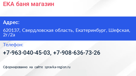 ЕКА-баня, магазин по адресу 620137, Свердловская область, Екатеринбург, Шефская, 2г/2а в дальнейшем Организация, размещена в следующих категориях: