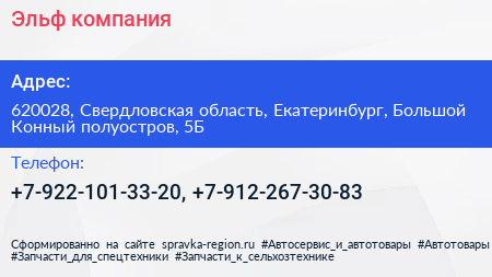 Эльф, компания по адресу 620028, Свердловская область, Екатеринбург, Большой Конный полуостров, 5Б в дальнейшем Организация, размещена в следующих категориях: