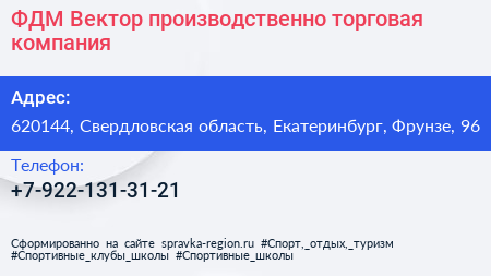 ФДМ Вектор, производственно-торговая компания по адресу 620144, Свердловская область, Екатеринбург, Фрунзе, 96 в дальнейшем Организация, размещена в следующих категориях: