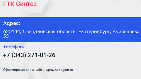 ГТК Синтез по адресу 620144, Свердловская область, Екатеринбург, Куйбышева, 55 в дальнейшем Организация, размещена в следующих категориях: