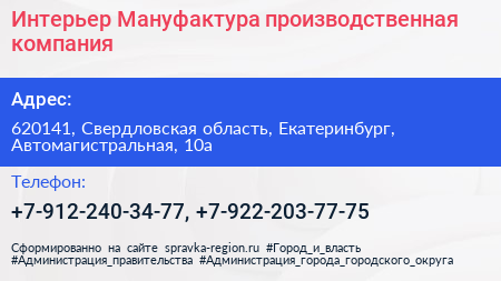 Интерьер Мануфактура, производственная компания по адресу 620141, Свердловская область, Екатеринбург, Автомагистральная, 10а в дальнейшем Организация, размещена в следующих категориях: