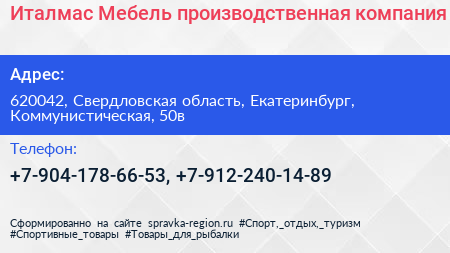 Италмас Мебель, производственная компания по адресу 620042, Свердловская область, Екатеринбург, Коммунистическая, 50в в дальнейшем Организация, размещена в следующих категориях: