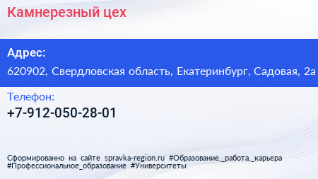 Камнерезный цех по адресу 620902, Свердловская область, Екатеринбург, Садовая, 2а в дальнейшем Организация, размещена в следующих категориях: