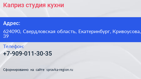 Каприз, студия кухни по адресу 624090, Свердловская область, Екатеринбург, Кривоусова, 39 в дальнейшем Организация, размещена в следующих категориях:
