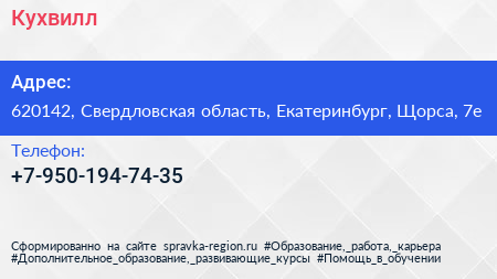 Кухвилл по адресу 620142, Свердловская область, Екатеринбург, Щорса, 7е в дальнейшем Организация, размещена в следующих категориях:
