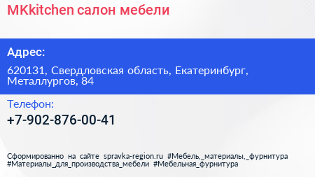 MKkitchen, салон мебели по адресу 620131, Свердловская область, Екатеринбург, Металлургов, 84 в дальнейшем Организация, размещена в следующих категориях: