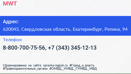 MWT по адресу 620043, Свердловская область, Екатеринбург, Репина, 94 в дальнейшем Организация, размещена в следующих категориях: