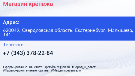 Магазин крепежа по адресу 620049, Свердловская область, Екатеринбург, Малышева, 141 в дальнейшем Организация, размещена в следующих категориях: