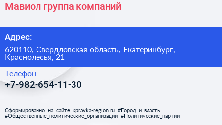 Мавиол, группа компаний по адресу 620110, Свердловская область, Екатеринбург, Краснолесья, 21 в дальнейшем Организация, размещена в следующих категориях: