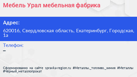 Мебель Урал, мебельная фабрика по адресу 620016, Свердловская область, Екатеринбург, Городская, 1а в дальнейшем Организация, размещена в следующих категориях: