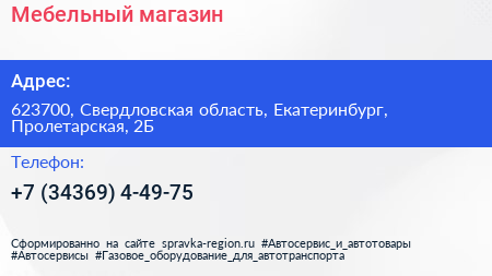 Мебельный магазин по адресу 623700, Свердловская область, Екатеринбург, Пролетарская, 2Б в дальнейшем Организация, размещена в следующих категориях: