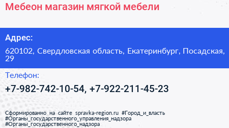 Мебеон, магазин мягкой мебели по адресу 620102, Свердловская область, Екатеринбург, Посадская, 29 в дальнейшем Организация, размещена в следующих категориях:
