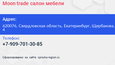 Moon-trade, салон мебели по адресу 620076, Свердловская область, Екатеринбург, Щербакова, 4 в дальнейшем Организация, размещена в следующих категориях: