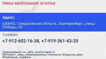 Ника, мебельное ателье по адресу 620042, Свердловская область, Екатеринбург, улица Победы, 65 в дальнейшем Организация, размещена в следующих категориях: