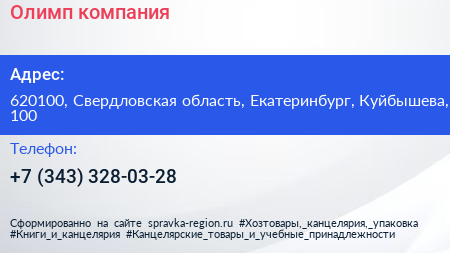 Олимп, компания по адресу 620100, Свердловская область, Екатеринбург, Куйбышева, 100 в дальнейшем Организация, размещена в следующих категориях: