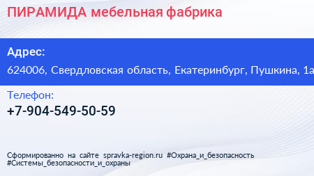 ПИРАМИДА, мебельная фабрика по адресу 624006, Свердловская область, Екатеринбург, Пушкина, 1а в дальнейшем Организация, размещена в следующих категориях: