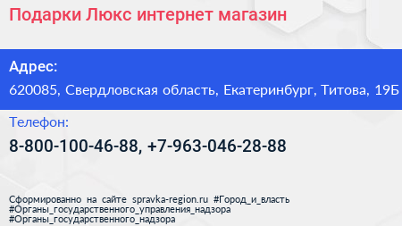 Подарки Люкс, интернет-магазин по адресу 620085, Свердловская область, Екатеринбург, Титова, 19Б в дальнейшем Организация, размещена в следующих категориях: