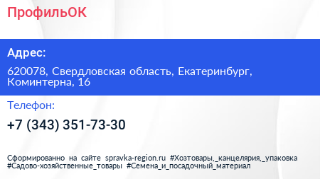 ПрофильОК по адресу 620078, Свердловская область, Екатеринбург, Коминтерна, 16 в дальнейшем Организация, размещена в следующих категориях: