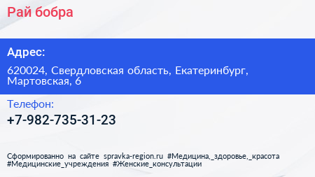 Рай бобра по адресу 620024, Свердловская область, Екатеринбург, Мартовская, 6 в дальнейшем Организация, размещена в следующих категориях:
