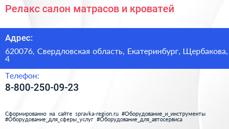 Релакс, салон матрасов и кроватей по адресу 620076, Свердловская область, Екатеринбург, Щербакова, 4 в дальнейшем Организация, размещена в следующих категориях: