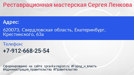 Реставрационная мастерская Сергея Ленкова по адресу 620073, Свердловская область, Екатеринбург, Крестинского, 63а в дальнейшем Организация, размещена в следующих категориях: