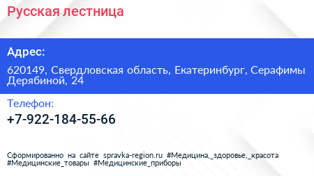 Русская лестница по адресу 620149, Свердловская область, Екатеринбург, Серафимы Дерябиной, 24 в дальнейшем Организация, размещена в следующих категориях:
