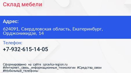 Склад мебели по адресу 624091, Свердловская область, Екатеринбург, Орджоникидзе, 14 в дальнейшем Организация, размещена в следующих категориях: