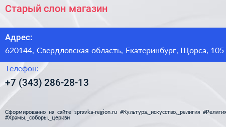 Старый слон, магазин по адресу 620144, Свердловская область, Екатеринбург, Щорса, 105 в дальнейшем Организация, размещена в следующих категориях: