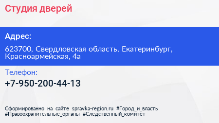 Студия дверей по адресу 623700, Свердловская область, Екатеринбург, Красноармейская, 4а в дальнейшем Организация, размещена в следующих категориях: