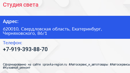 Студия света по адресу 620010, Свердловская область, Екатеринбург, Черняховского, 86/1 в дальнейшем Организация, размещена в следующих категориях: