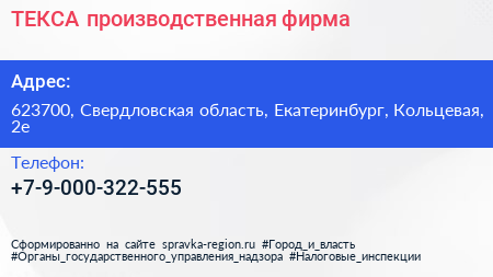 ТЕКСА, производственная фирма по адресу 623700, Свердловская область, Екатеринбург, Кольцевая, 2е в дальнейшем Организация, размещена в следующих категориях: