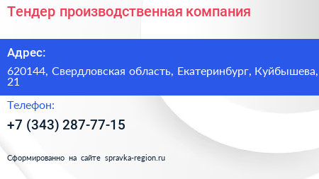 Тендер, производственная компания по адресу 620144, Свердловская область, Екатеринбург, Куйбышева, 21 в дальнейшем Организация, размещена в следующих категориях: