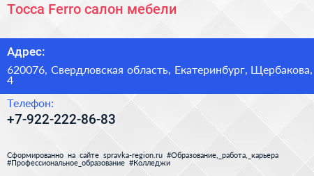 Tocca Ferro, салон мебели по адресу 620076, Свердловская область, Екатеринбург, Щербакова, 4 в дальнейшем Организация, размещена в следующих категориях: