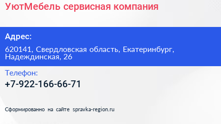 УютМебель, сервисная компания по адресу 620141, Свердловская область, Екатеринбург, Надеждинская, 26 в дальнейшем Организация, размещена в следующих категориях: