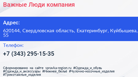 Важные Люди, компания по адресу 620144, Свердловская область, Екатеринбург, Куйбышева, 55 в дальнейшем Организация, размещена в следующих категориях: