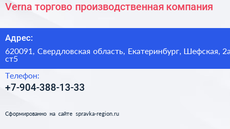Verna, торгово-производственная компания по адресу 620091, Свердловская область, Екатеринбург, Шефская, 2а ст5 в дальнейшем Организация, размещена в следующих категориях: