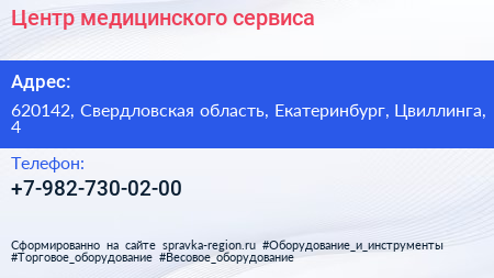 Центр медицинского сервиса по адресу 620142, Свердловская область, Екатеринбург, Цвиллинга, 4 в дальнейшем Организация, размещена в следующих категориях: