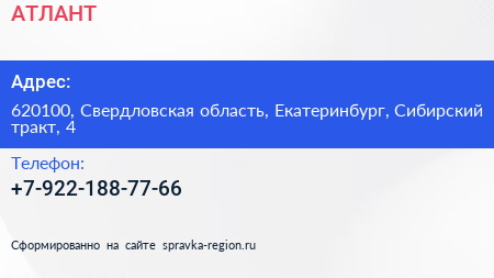 АТЛАНТ по адресу 620100, Свердловская область, Екатеринбург, Сибирский тракт, 4 в дальнейшем Организация, размещена в следующих категориях: