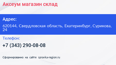 Аксеум, магазин-склад по адресу 620144, Свердловская область, Екатеринбург, Сурикова, 24 в дальнейшем Организация, размещена в следующих категориях: