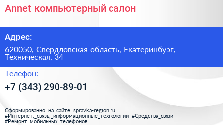 Annet, компьютерный салон по адресу 620050, Свердловская область, Екатеринбург, Техническая, 34 в дальнейшем Организация, размещена в следующих категориях: