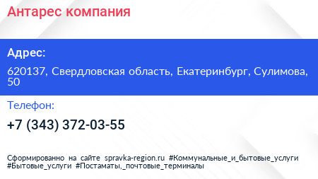 Для связи с организацией воспользуйтесь номером телефона: +7 (343) 372-03-55. Пн: c 10:00-18:00, Вт: c 10:00-18:00, Ср: c 10:00-18:00, Чт: c 10:00-18:00, Пт: c 10:00-18:00, Сб: выходной, Вс: выходной. по предварительному звонку: пн-пт, вы можете обратиться в эту организацию.