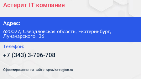 Астерит, IT-компания по адресу 620027, Свердловская область, Екатеринбург, Луначарского, 36 в дальнейшем Организация, размещена в следующих категориях: