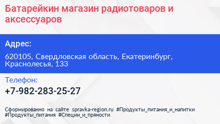 Батарейкин, магазин радиотоваров и аксессуаров по адресу 620105, Свердловская область, Екатеринбург, Краснолесья, 133 в дальнейшем Организация, размещена в следующих категориях: