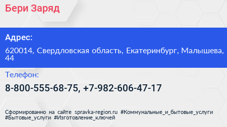 Бери Заряд по адресу 620014, Свердловская область, Екатеринбург, Малышева, 44 в дальнейшем Организация, размещена в следующих категориях: