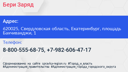 Бери Заряд по адресу 620025, Свердловская область, Екатеринбург, площадь Бахчиванджи, 1 в дальнейшем Организация, размещена в следующих категориях: