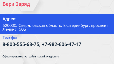 Бери Заряд по адресу 620000, Свердловская область, Екатеринбург, проспект Ленина, 50Б в дальнейшем Организация, размещена в следующих категориях: