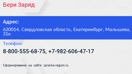 Бери Заряд по адресу 620014, Свердловская область, Екатеринбург, Малышева, 31к в дальнейшем Организация, размещена в следующих категориях: