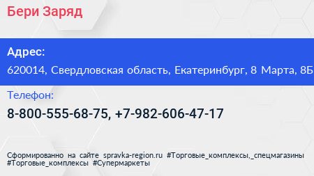 Бери Заряд по адресу 620014, Свердловская область, Екатеринбург, 8 Марта, 8Б в дальнейшем Организация, размещена в следующих категориях: