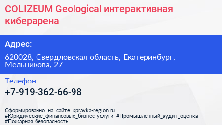 COLIZEUM Geological, интерактивная киберарена по адресу 620028, Свердловская область, Екатеринбург, Мельникова, 27 в дальнейшем Организация, размещена в следующих категориях: