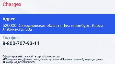 Chargex по адресу 620000, Свердловская область, Екатеринбург, Карла Либкнехта, 38а в дальнейшем Организация, размещена в следующих категориях: